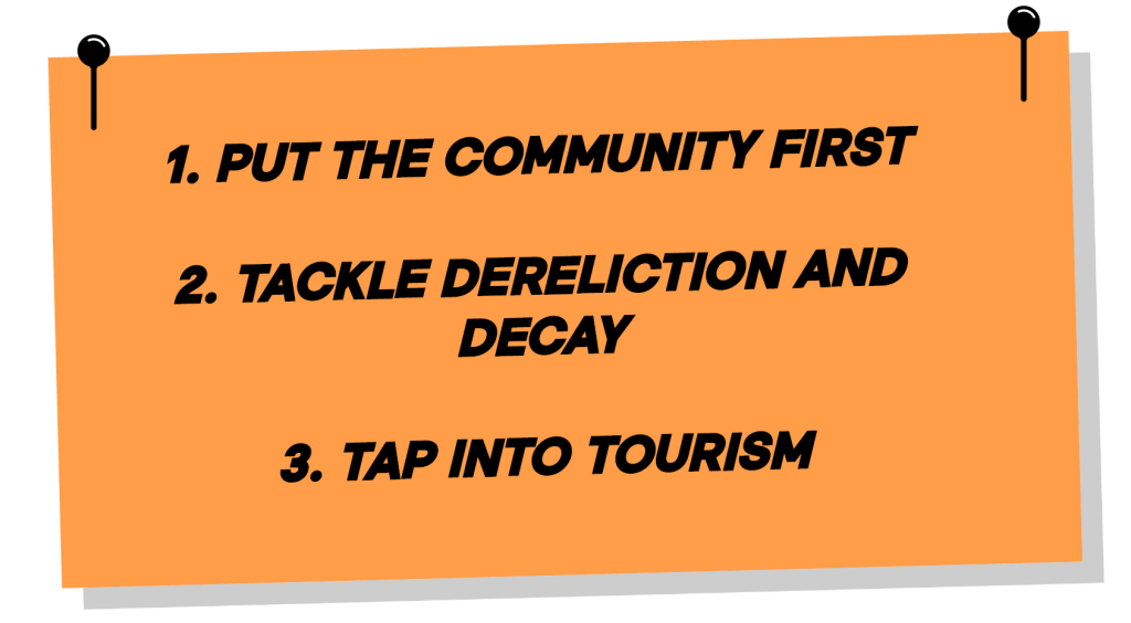 Each priority area proposes a series of aims and actions. This summary page contains only the aims, but the more detailed actions can be found in the complete report here: Local Place Plan.