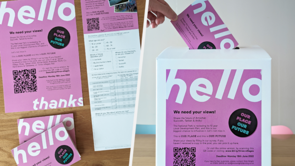 The first step in public consultation was the distribution of a survey in summer 2022. The content and appearance of the survey was guided by an independent steering group, made up of Community Council and Development Trust members, parents of children at the local school, and business owners – among others. The result was a paper survey that was delivered to every house in the community, with extra copies in public places, and post-boxes to return them in multiple locations. This was accompanied by an online version, which was distributed by QR codes on buses, in shops, on social media, and in the local newspapers.