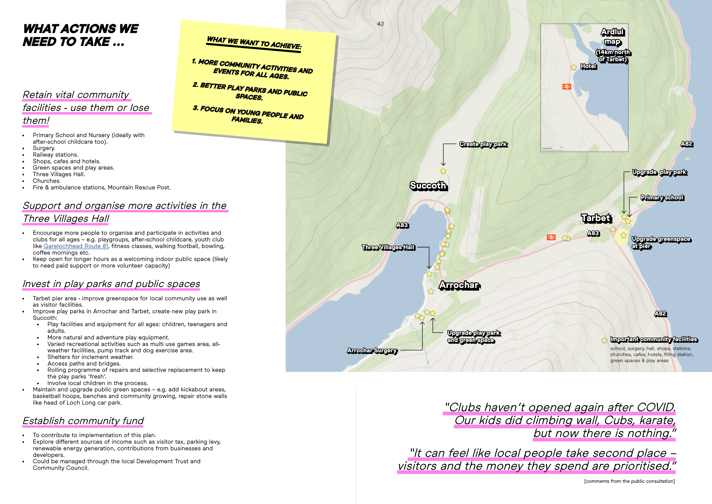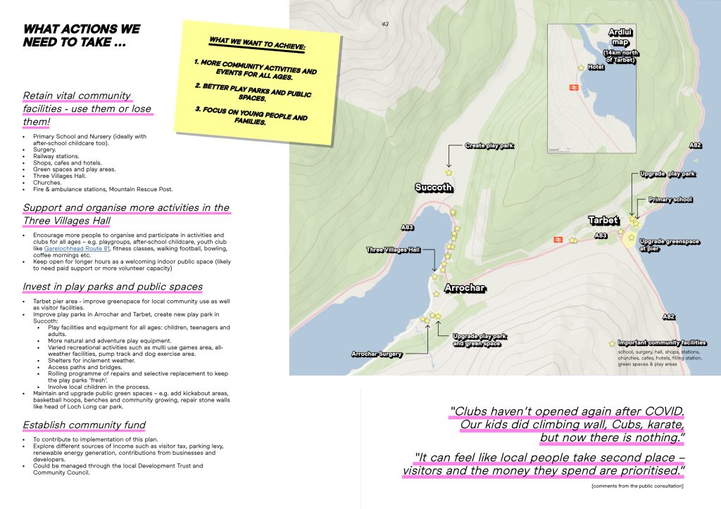 Following completion of the survey, the Community Council and consultant team invited the community to two events in the Three Villages Hall in Arrochar to share the survey results, and agree what the priorities were and what to do about them.
