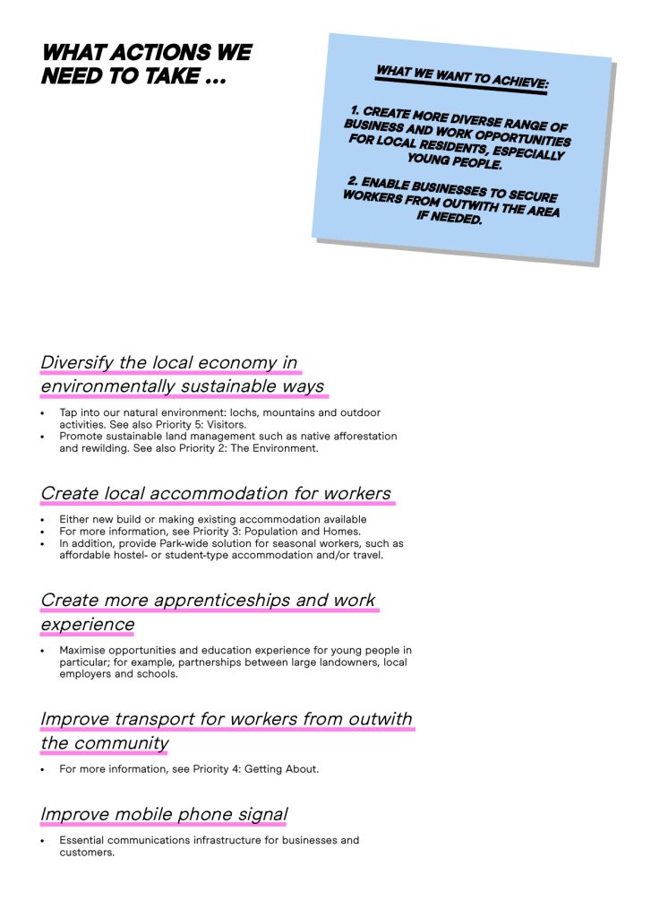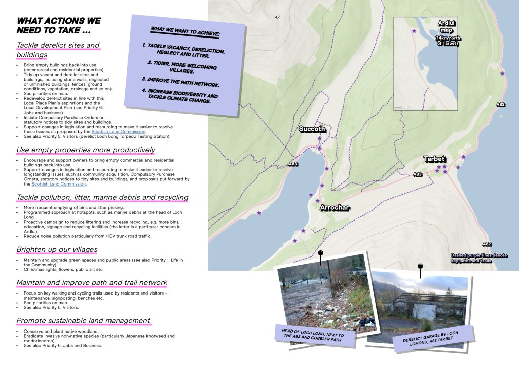 Each priority area proposes a series of aims and actions. This summary page contains only the aims, but the more detailed actions can be found in the complete report here: Local Place Plan.