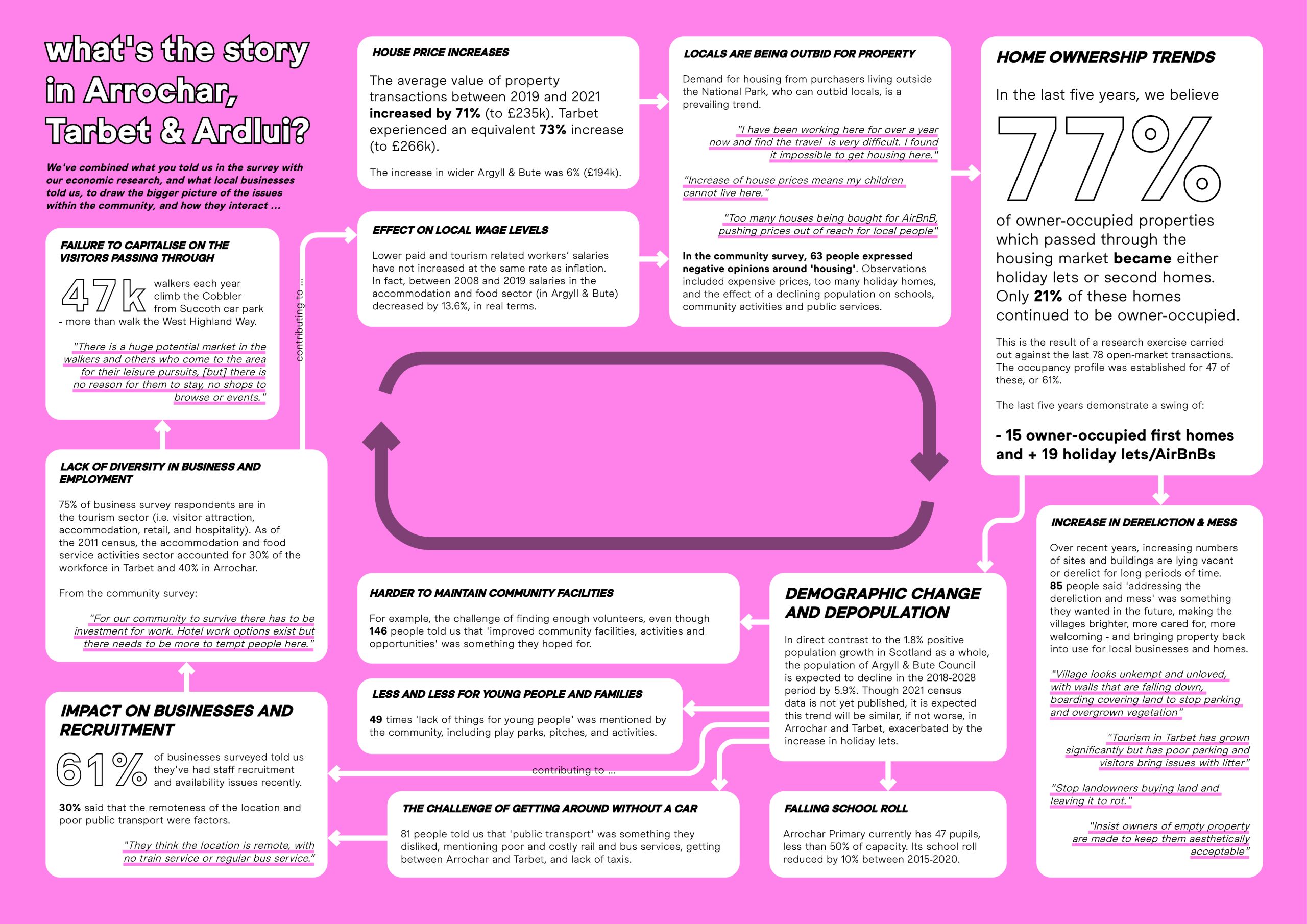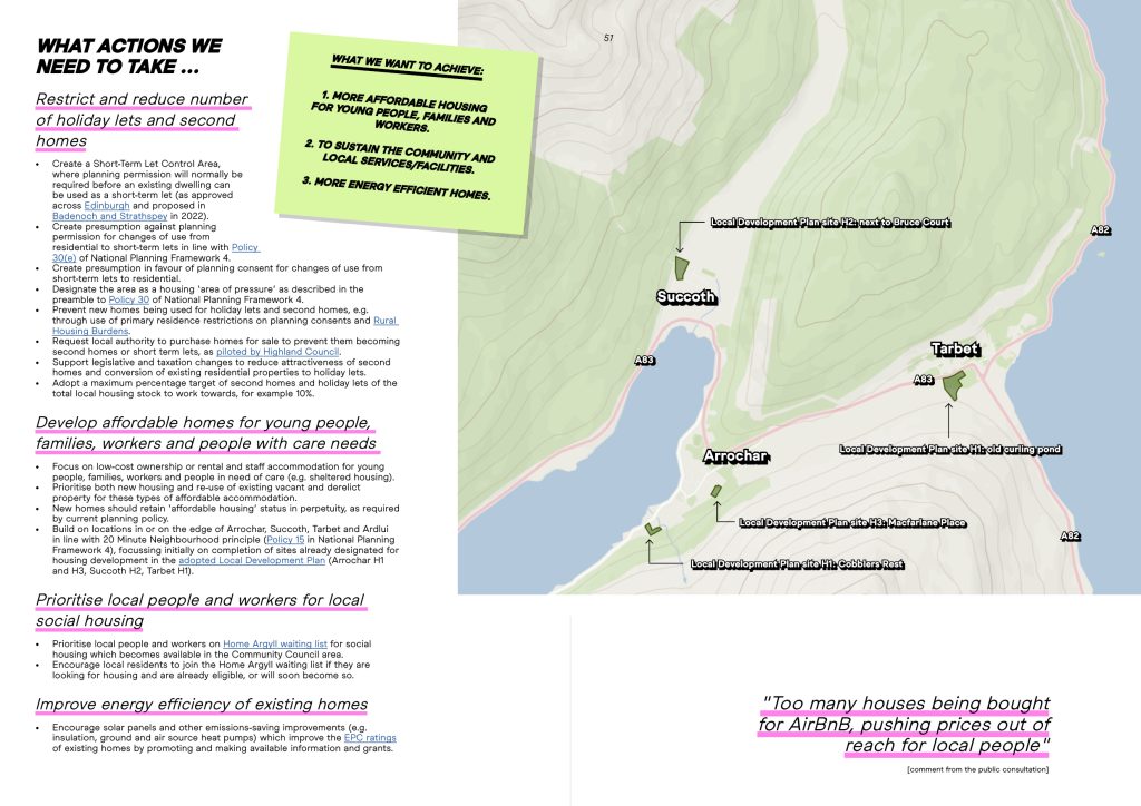 Expensive house prices and an ever-increasing number of second homes and holiday lets create huge challenges for our community. The average house price has increased by over 70% in Arrochar and Tarbet since 2019, and three-quarters of homes sold since 2017 have become holiday lets or second homes. The twin impacts are that local people and workers are priced out of the market, and the declining full-time population reduces the viability of local schools, local services, businesses and community activities.
