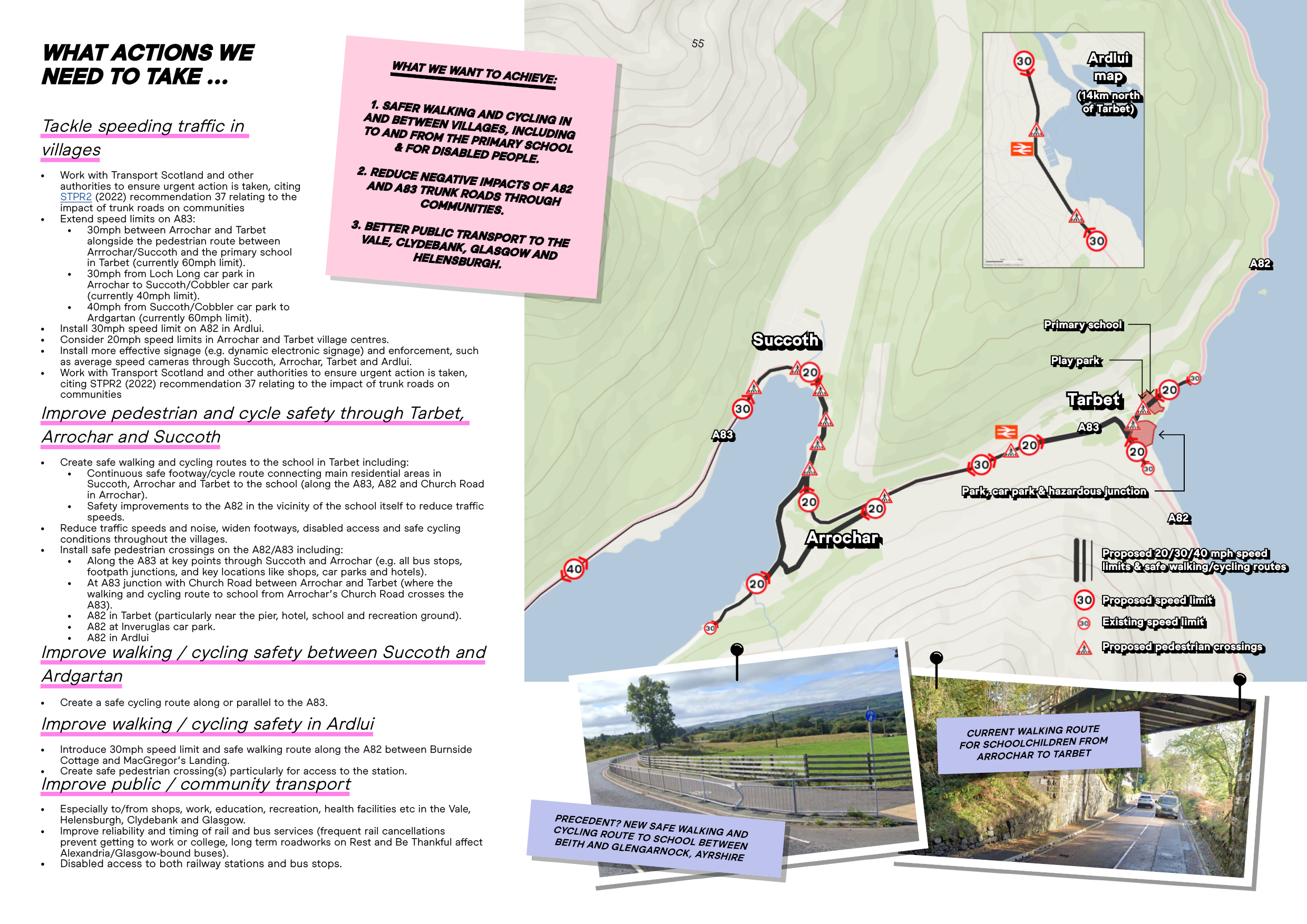Moving around the area is problematic for those without a car. Despite Scottish Government transport policy being to promote walking, cycling and public transport, our villages are dominated by trunk road vehicle traffic. Simple actions, like crossing the road to the shop or walking and cycling to school, are dangerous. Transport infrastructure needs to be redesigned to be safe for the communities it passes through, and we need public transport that enables us to access jobs, facilities and opportunities in the Vale and Helensburgh.