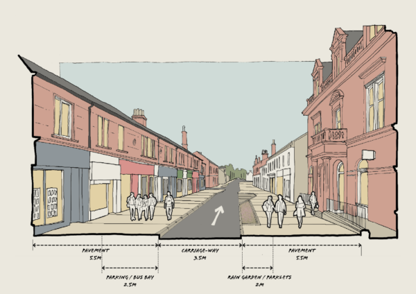 Similar to Option 2, this option retains the existing two-way road layout while giving the desired wider and re-surfaced pavements to one side of the street, leading to a comfortable retail area on the East-side of the street. The reduced road width offers natural traffic-calming and safety for users.
