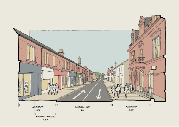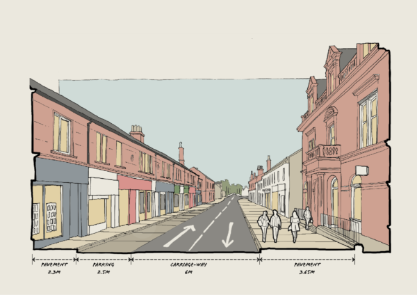 Retaining the existing two-way road layout while applying the publicly desired wider re-surfaced pavements to both sides of the street leads to a comfortable retail area. The reduced road width offers natural traffic-calming and safety for pedestrians.