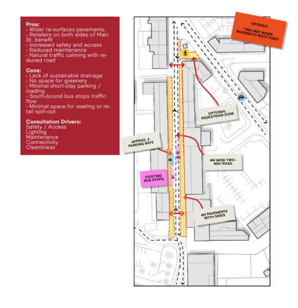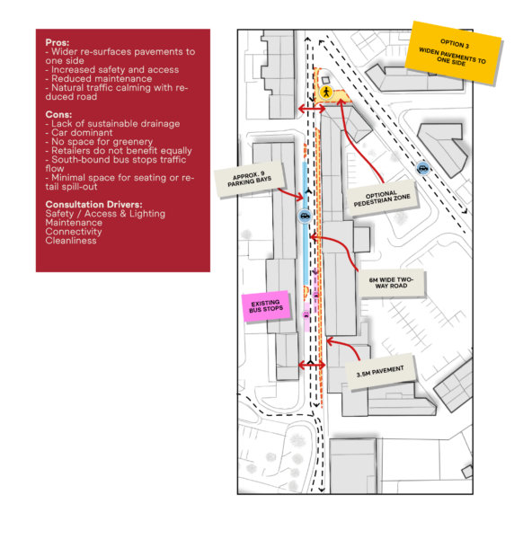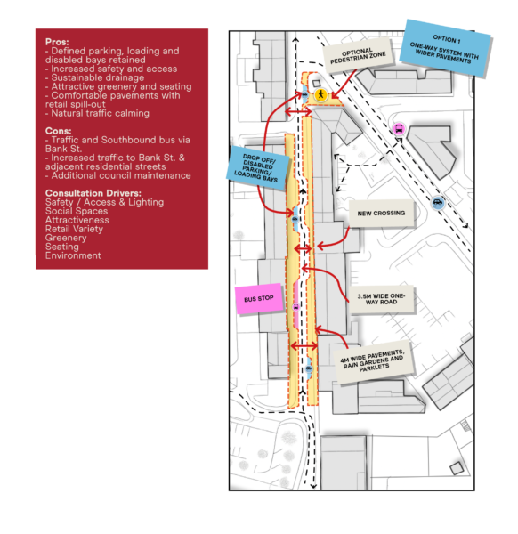 This option offers wider, newly surfaced pavements, with them being wide enough in areas for spill out space which businesses could utilise and benefit from. The more frequently used North-bound bus stop is retained with a bus pull-in zone to reduce traffic disruption, while the south-bound bus stop is nearby on Bank St.