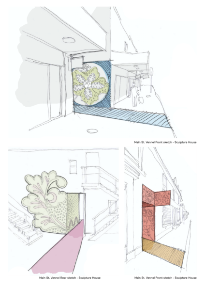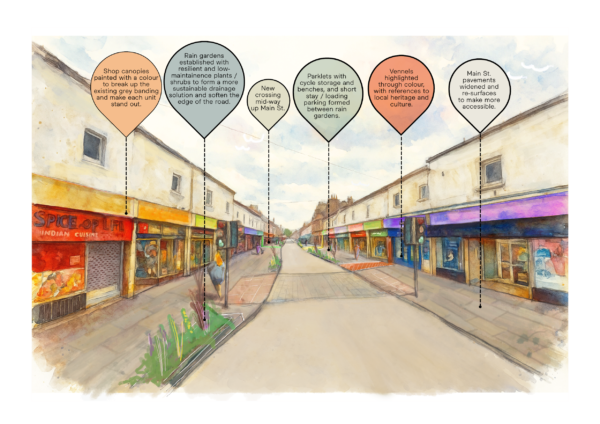 The coloured floor could spill out into Main St., making the vennels feel more public and welcoming, while wall art and creative lighting could reference culture and heritage of the town. How each vennel is seen from approaching directions should be further analysed at the next stage, and proposals designed to best highlight them.