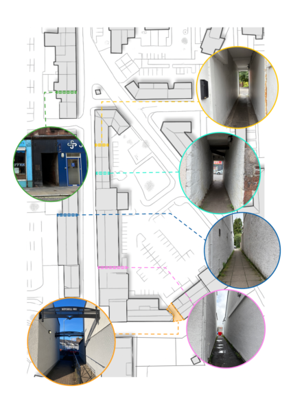 Taking a lighter-touch approach than on Main St., the proposals seek to improve poor areas of the existing surfaces, and install new lighting to make the street and vennel feel safer to use.