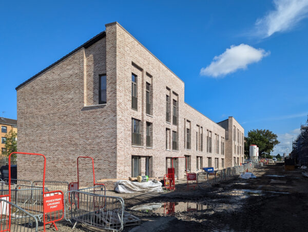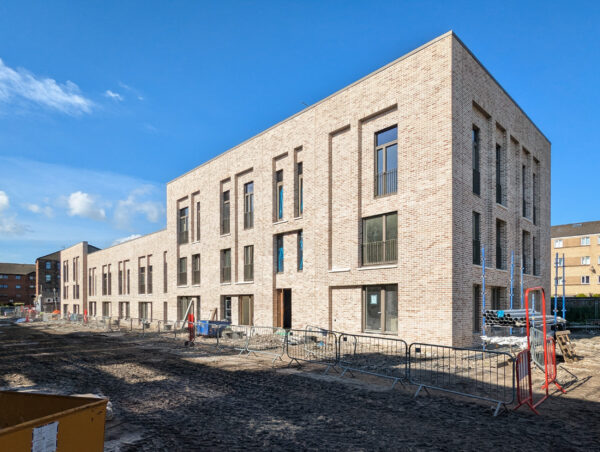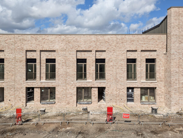 Scaffolding came down in summer 2025 to uncover the first of the three new housing blocks. The reveal of the carefully composed brick elevations, with generous windows, deep reveals, and precast concrete details, signalled a significant moment in the delivery of this project. Underpinned by an efficient timber frame construction, the design has sense of weight and permanence – reflecting a commitment to quality and longevity in affordable housing.